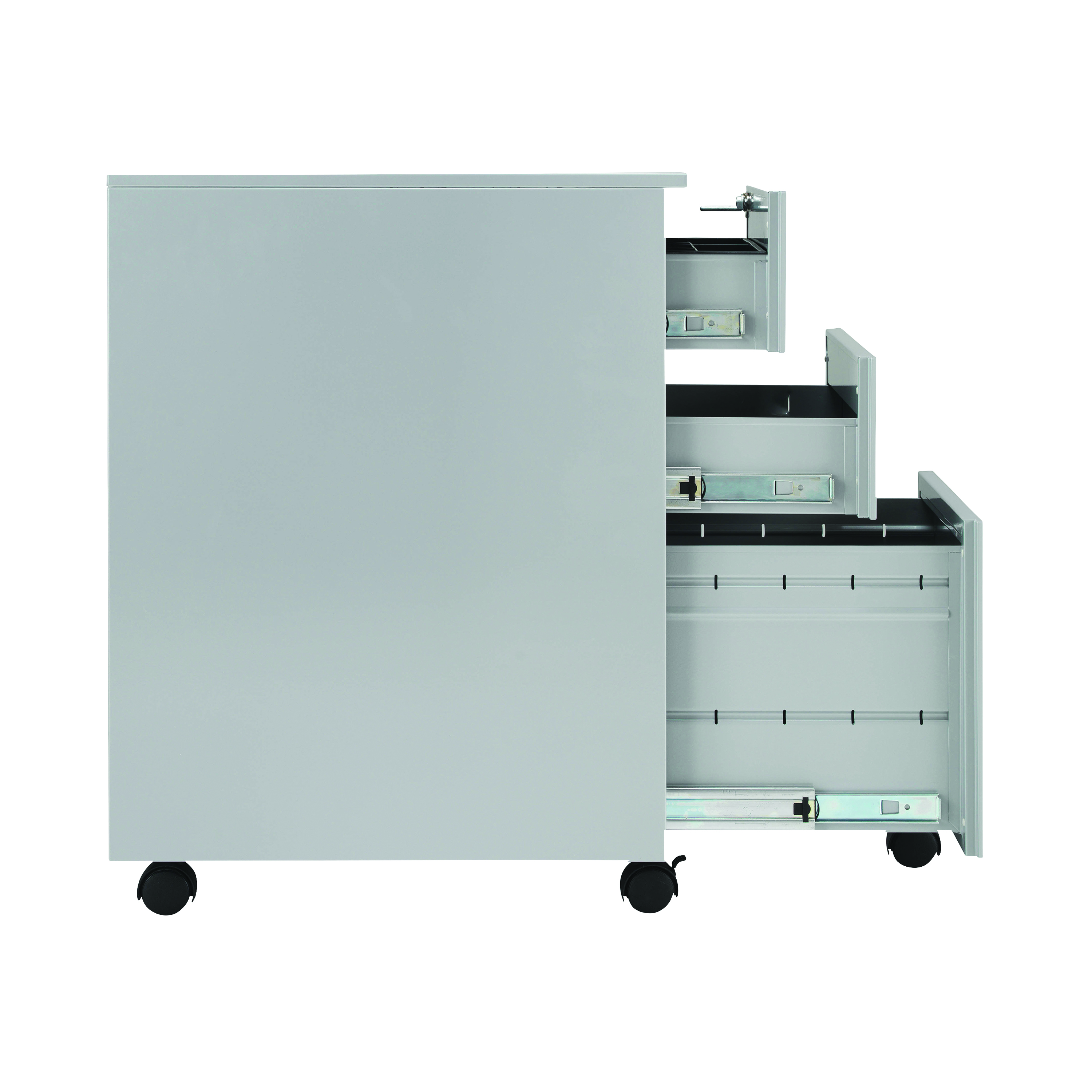 This entry level First mobile steel pedestal features 2 stationery drawers and 1 filing drawer suitable for use with A4 suspension files. The tough steel carcass features an anti-tilt mechanism, allowing only 1 drawer open at a time. This pedestal measures W380 x D470 x H615mm and comes in a silver finish with an integrated handle design.